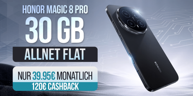Honor Magic 8 Pro 512GB mit Voucher für einmalig 239 Euro mit 30GB Allnet Flat und 240 Euro Cashback nur 39.95 Euro monatlich. Bis maximal zum 15.04.2026 verfügbar, kann vorher ausverkauft bzw. in der angegebenen beendet sein. Somit, nur solange der Vorrat beim Anbieter reicht! Beachte bitte mögliche Einschränkungen bei der Rufnummermitnahme, alle Informationen zur Rufnummermitnahme findest du HIER. Eine Terminierung (Wunschdatum) ist bei diesem Angebot nicht möglich. Einmalige Anschlussgebühr 39.95,-€. Mindestvertragslaufzeit 24 Monate. Telekom MagentaEINS ist bei diesem Vertrag möglich.