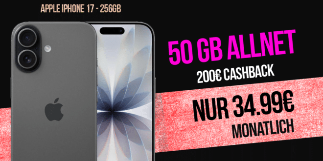 iPhone 17 256GB für einmalig 419 Euro mit 50GB Allnet Flat und 50 Euro Wechselbonus und 200 Euro Cashback nur 34.99 Euro monatlich. Bis maximal zum 05.02.2026 verfügbar, kann vorher ausverkauft bzw. in der angegebenen beendet sein. Somit, nur solange der Vorrat beim Anbieter reicht! Beachte bitte mögliche Einschränkungen bei der Rufnummermitnahme, alle Informationen zur Rufnummermitnahme findest du HIER. Eine Terminierung (Wunschdatum) ist bei diesem Angebot nicht möglich. Einmalige Anschlussgebühr 39.99,-€. Mindestvertragslaufzeit 24 Monate.