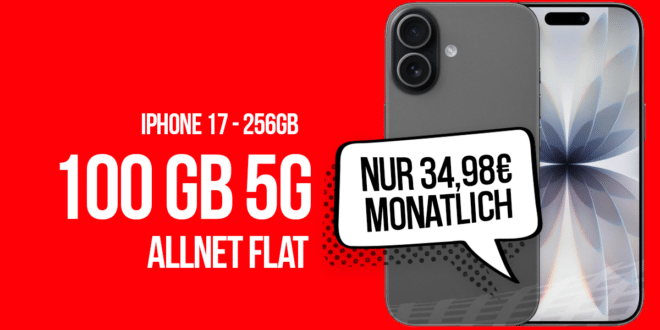iPhone 17 256GB für einmalig 49 Euro mit 100GB Allnet Flat und 120 Euro Cashback nur 34.98 Euro monatlich. Bis maximal zum 20.03.2026 verfügbar, kann vorher ausverkauft bzw. in der angegebenen beendet sein. Somit, nur solange der Vorrat beim Anbieter reicht! Beachte bitte mögliche Einschränkungen bei der Rufnummermitnahme, alle Informationen zur Rufnummermitnahme findest du HIER. Eine Terminierung (Wunschdatum) ist bei diesem Angebot nicht möglich. Einmalige Anschlussgebühr in Höhe von 39,99,- €. Mindestvertragslaufzeit 24 Monate.