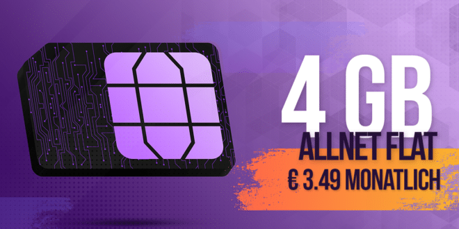 monatlich kündbar – 4GB Allnet Flat nur 3.49 Euro monatlich. 9.99€ Bereitstellungspreis.