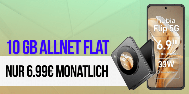 Nubia Flip 5G mit Vertrag im o2 Netz. 10GB Allnet Flat nur 6.99 Euro monatlich. Bis maximal zum 09.03.2026 verfügbar, kann vorher ausverkauft bzw. in der angegebenen beendet sein. Somit, nur solange der Vorrat beim Anbieter reicht! Beachte bitte mögliche Einschränkungen bei der Rufnummermitnahme, alle Informationen zur Rufnummermitnahme findest du HIER. Eine Terminierung (Wunschdatum) ist bei diesem Angebot nicht möglich. Einmalige Anschlussgebühr 39.99,-€. Mindestvertragslaufzeit 24 Monate.