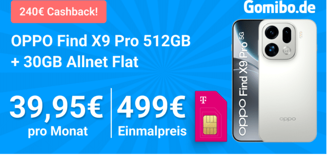 OPPO Find X9 Pro 512GB für einmalig 499 Euro mit 30GB Allnet Flat und 240 Euro Cashback nur 39.95 Euro monatlich. Bis maximal zum 15.02.2026 verfügbar, kann vorher ausverkauft bzw. in der angegebenen beendet sein. Somit, nur solange der Vorrat beim Anbieter reicht! Beachte bitte mögliche Einschränkungen bei der Rufnummermitnahme, alle Informationen zur Rufnummermitnahme findest du HIER. Eine Terminierung (Wunschdatum) ist bei diesem Angebot nicht möglich. Einmalige Anschlussgebühr 39.95,-€. Mindestvertragslaufzeit 24 Monate.