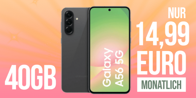 Samsung Galaxy A56 256GB für einmalig 69.99 Euro mit 40GB Allnet Flat nur 14.99 Euro monatlich. Bis maximal zum 15.01.2026 verfügbar, kann vorher ausverkauft bzw. in der angegebenen beendet sein. Somit, nur solange der Vorrat beim Anbieter reicht! Beachte bitte mögliche Einschränkungen bei der Rufnummermitnahme, alle Informationen zur Rufnummermitnahme findest du HIER. Eine Terminierung (Wunschdatum) ist bei diesem Angebot nicht möglich. Einmalige Anschlussgebühr in Höhe von 39,99 €. Mindestvertragslaufzeit 24 Monate.