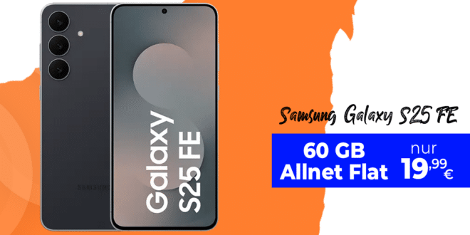 Samsung Galaxy S25 FE 128GB für einmalig 39 Euro mit 60GB Allnet Flat nur 19.99 Euro monatlich. Bis maximal zum 10.01.2026 verfügbar, kann vorher ausverkauft bzw. in der angegebenen beendet sein. Somit, nur solange der Vorrat beim Anbieter reicht! Beachte bitte mögliche Einschränkungen bei der Rufnummermitnahme, alle Informationen zur Rufnummermitnahme findest du HIER. Eine Terminierung (Wunschdatum) ist bei diesem Angebot nicht möglich. Einmalige Anschlussgebühr 39.99,-€, nur für eine SIM Karte. Mindestvertragslaufzeit 24 Monate.