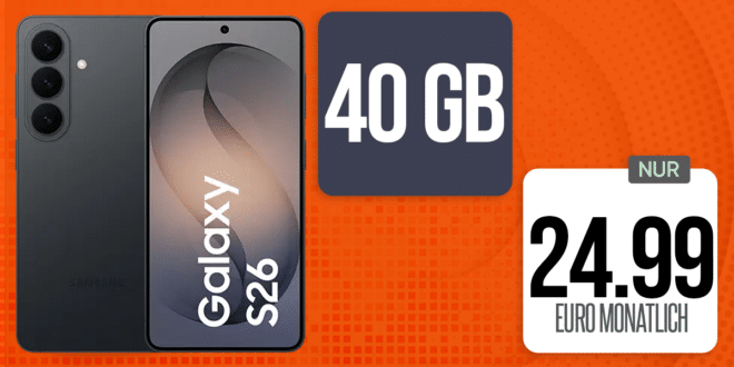 HOT DEAL! Samsung Galaxy S26 256GB für einmalig 129 Euro mit 40GB Allnet Flat nur 24.99 Euro monatlich. Bis maximal zum 20.04.2026 verfügbar, kann vorher ausverkauft bzw. in der angegebenen beendet sein. Somit, nur solange der Vorrat beim Anbieter reicht! Beachte bitte mögliche Einschränkungen bei der Rufnummermitnahme, alle Informationen zur Rufnummermitnahme findest du HIER. Eine Terminierung (Wunschdatum) ist bei diesem Angebot nicht möglich. Einmalige Anschlussgebühr 39.99,-€. Mindestvertragslaufzeit 24 Monate.