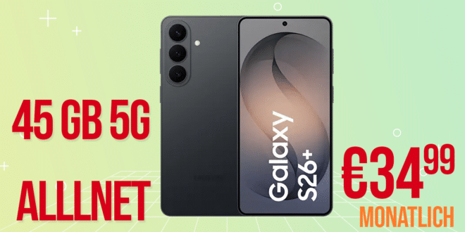 Samsung Galaxy S26 Plus 512GB mit Gutscheincode für einmalig 259 Euro mit 45GB Allnet Flat und 100 Euro Wechselbonus nur 34.99 Euro monatlich. Bis maximal zum 05.04.2026 verfügbar, kann vorher ausverkauft bzw. in der angegebenen beendet sein. Somit, nur solange der Vorrat beim Anbieter reicht! Beachte bitte mögliche Einschränkungen bei der Rufnummermitnahme, alle Informationen zur Rufnummermitnahme findest du HIER. Eine Terminierung (Wunschdatum) ist bei diesem Angebot nicht möglich. Einmalige Anschlussgebühr 39.99,-€, kann per App gespart werden. Mindestvertragslaufzeit 24 Monate.