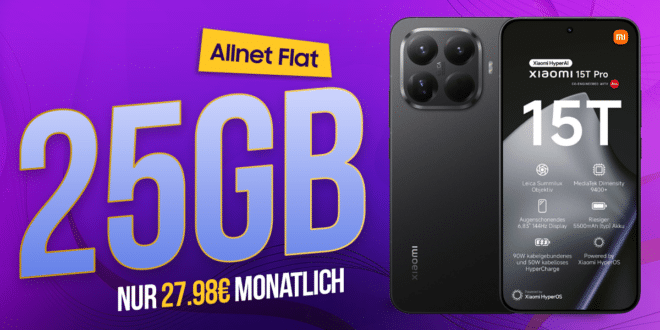 Xiaomi 15T Pro 512GB für einmalig 39 Euro mit 25GB Allnet Flat (+15GB extra SIM) nur 27.98 Euro monatlich