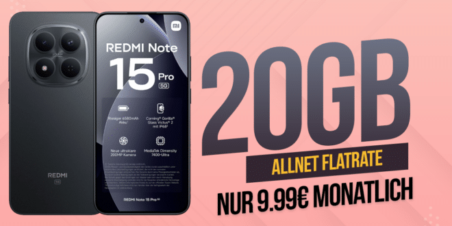 Xiaomi Redmi Note 15 Pro 256GB für einmalig 99 Euro mit 20GB Allnet Flat nur 9.99 Euro monatlich. Bis maximal zum 20.02.2026 verfügbar, kann vorher ausverkauft bzw. in der angegebenen beendet sein. Somit, nur solange der Vorrat beim Anbieter reicht! Beachte bitte mögliche Einschränkungen bei der Rufnummermitnahme, alle Informationen zur Rufnummermitnahme findest du HIER. Eine Terminierung (Wunschdatum) ist bei diesem Angebot nicht möglich. Einmalige Anschlussgebühr 39.99,-€. Mindestvertragslaufzeit 24 Monate.