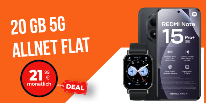 Xiaomi Redmi Note 15 Pro+ 256GB & Redmi Watch 5 Lite mit 20GB Allnet Flat nur 21.99 Euro monatlich – 30GB nur 22.99 Euro. Bis maximal zum 30.04.2026 verfügbar, kann vorher ausverkauft bzw. in der angegebenen beendet sein. Somit, nur solange der Vorrat beim Anbieter reicht! Beachte bitte mögliche Einschränkungen bei der Rufnummermitnahme, alle Informationen zur Rufnummermitnahme findest du HIER. Eine Terminierung (Wunschdatum) ist bei diesem Angebot nicht möglich. Einmalige Anschlussgebühr 0,-€. Mindestvertragslaufzeit 24 Monate.